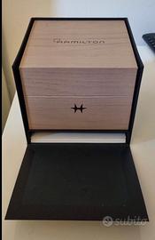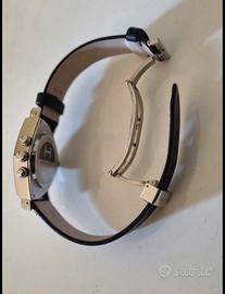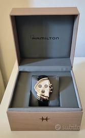 Elegante orologio cronografo Hamilton, modello dal design iconico e distintivo, prodotto nel 2023. La cassa presenta la caratteristica forma triangolare/asimmetrica, simbolo della linea Ventura, realizzata in acciaio lucido che dona grande luminosità e presenza al polso. Il quadrante chiaro è impreziosito da tre contatori cronografici neri a contrasto, che conferiscono un look sportivo ma raffinato. Indici sottili e lancette dal design moderno garantiscono ottima leggibilità, mentre il datario posizionato a ore 4 aggiunge funzionalità. Il cinturino in pelle nera completa l’estetica con un tocco classico ed elegante, rendendo questo orologio adatto sia ad outfit casual che più formali. Movimento preciso e affidabile tipico della qualità svizzera “Swiss Made”. Un segnatempo perfetto per chi cerca uno stile originale, fuori dagli schemi, senza rinunciare a eleganza e prestazioni.
