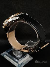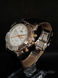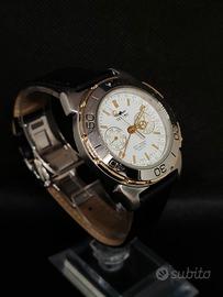 Ciao amico appassionato! ⌚ Oggi ti presento il Sector ADV 4500 Calendar, un orologio degli anni '90 che trasforma le complicazioni tecniche in poesia meccanica. La cassa in acciaio da 38 mm è scolpita come un lingotto levigato dal mare, con linee pulite che evocano strumenti di bordo di un veliero. La ghiera girevole unidirezionale presenta una scala minuti incisa, simile ai solchi di un vinile d’epoca. Il vetro minerale protegge un quadrante bianco opaco, dove indici dorati applicati brillano come monete al sole. I sub-contatori giorno e data tono su tono sono discreti come targhette d’ottone su una valigia di viaggio. La lancetta delle settimane danza sul rehaut, tracciando il tempo come un dito su un vecchio calendario murale. Al cuore dell'orologio batte un movimento svizzero Ronda al quarzo, preciso come il battito d’un pendolo d’aeroporto. Le complicazioni del calendario si muovono con la solennità di un orologio da torre medievale. Impermeabile fino a 100 metri, è pronto a seguirti in piscina o sotto la pioggia battente di un autunno veneto. Il cinturino in pelle nuovo con chiusura deployante è morbido come il dorso di un libro antico, adattandosi al polso con discreta eleganza. I tasti dorati per la regolazione del datario brillano come chiavi d’oro per un piccolo scrigno di funzionalità. Condizioni: Batteria nuova, guarnizione del fondello ripristinata, lavato a ultrasuoni e leggermente lucidato per ridargli lucentezza. Segni d’uso leggeri: non difetti, ma firme del tempo. Prezzo: 140€ + 11€ spedizione tracciata o con tutto subito. Consegna a mano: Disponibile tra Este (PD) e Badia Polesine (RO). Un orologio che non è solo un accessorio, ma una conversazione. Fa parte della mia raccolta privata, e come spesso accade con ciò che si ama, a volte lo si lascia andare. Non è una vendita professionale, solo una cessione ad un altro appassionato.