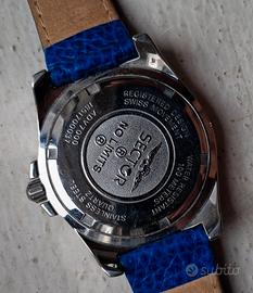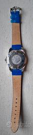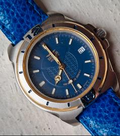 orologio Sector ADV Blu con indicatori dorati e datario. Presenta l'indicazione "100 M / 330 ft." che indica la resistenza all'acqua. Cassa: In metallo (probabilmente acciaio inossidabile) con dettagli dorati sulla ghiera. Cinturino: In pelle blu con texture a effetto lucertola. Movimento: "MOVEMENT" sul quadrante suggerisce un movimento al quarzo. usato raramente
