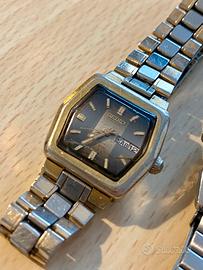 Raro Seiko Vintage degli anni '70/'80, modello 5846-5040 con quadrante bicolore., anche questo orologio è fermo e non è stato testato con una batteria nuova. Viene proposto come pezzo da collezione o per eventuale recupero parti/revisione. Presenta i normali segni del tempo che gli conferiscono un fascino vintage autentico. Cinturino originale marchiato Seiko.