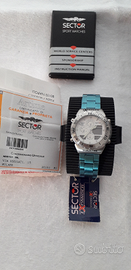 Orologio analogico/digitale,GMT, movimento al quarzo,Sector Expander mod.303 Wold Time - Fuori produzione - da collezione!!- . Assolutamente Intatto praticamente " NOS " !! Mai indossato,mai messo in misura , IN CONDIZIONI INCREDIBILI , immacolato, perfettamente funzionante, ancora con tutte le sue plastiche originali , orologio con moltissime funzioni, vetro zaffiro impermeabile 100 metri ,ghiera girevole , fondo bianco,cinturino in acciaio, marcato Swiss Made. Corredo completissimo ed assolutamente introvabile nel suo stato composto da : scatola, custodia Sector in gomma ,libretto istruzioni e garanzia timbrata del tempo . Vendo a Euro 300 , spese di imballo e spedizione comprese .Per ulteriori info scrivetemi .