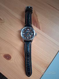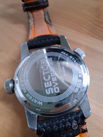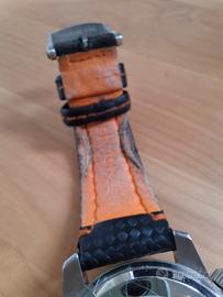 Orologio Sector con cinturino in pelle nera e arancione. - Cassa in acciaio. - Quadrante con dettagli arancioni e texture carbon look. - Resistente all'acqua. Non è presente la confezione. L'orologio presenta qualche segno di usura sul retro della cassa e sul cinturino. Scambio a mano in zona Roma Tiburtina.