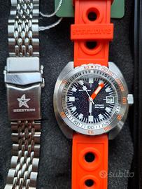 Vendo bellissimo orologio Seestern 200T Doxa hommage watch in acciaio, sub 200mt vetro zaffiro e 2 cinturini , 1 acciaio chicco di riso e 1 silicone arancione.