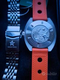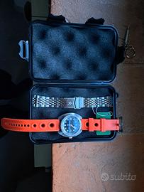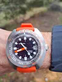 Vendo bellissimo orologio Seester 200T Doxa hommage watch in acciaio sub 200mt vetro zaffiro e 2 cinturini 1 in acciaio grana di riso e 1 silicone arancione. Come nuovo