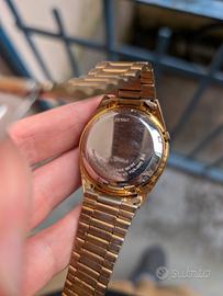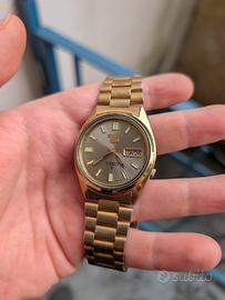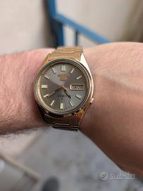 Propongo orologio Seiko 5 automatico dalla mia collezione privata. L'orologio, originale e perfettamente funzionante, presenta un design vintage. Le condizioni sono buone, come visibile dalle foto. Dettagli tecnici: - Cassa in acciaio da 37mm (esclusa corona) - Quadrante oro cinturino oro - Bracciale in acciaio con tutte le maglie - Cambio giorno e numero tramite scatti corona - Funzionalità day-date con doppio datario (inglese e spagnolo) - Ricarica automatica (non manuale o quarzo) Vendo per smaltimento collezione di famiglia. Sono disponibili altri modelli in bacheca. Possibile scambio a mano a Torino. #179