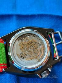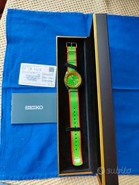IN VENDITA — Seiko 5 Sports Street Fighter V "Blanka" Edizione Limitata · Ref. SRPF23K1 Una rara opportunità di possedere uno dei soli 9.999 esemplari al mondo di questa ambitissima collaborazione tra Seiko e l'iconico franchise Street Fighter V di Capcom. Questa è l'edizione Blanka: audace, selvaggia e immediatamente riconoscibile. L'orologio è in condizioni eccellenti, indossato pochissimo, senza graffi o segni di usura significativi. Viene fornito completo di scatola originale, certificato di garanzia e scontrino d'acquisto datato 23/12/2025 da un rivenditore autorizzato Seiko. SPECIFICHE TECNICHE Movimento: Calibro Seiko 4R36, automatico con carica manuale, 24 rubini, 21.600 alternanze/ora, riserva di carica di circa 41 ore. Cassa: 42,5 mm di diametro, 13,4 mm di spessore, acciaio inossidabile grigio con rivestimento ionico, corona a ore 4 con protezione, fondello a vite trasparente inciso con il comando "Electric Thunder" e numero di serie individuale. Vetro: Hardlex. Lunghezza: Girevole unidirezionale, in alluminio verde e giallo con motivo Blanka. Quadrante: Verde acceso con texture a spirale ispirata all'attacco rotante di Blanka; indici a forma di dente, lancette con punta gialla. Cinturino: NATO originale in nylon verde/rosso con stampa della bambola Blanka-chan sulla punta. Impermeabilità: 100 m. Un vero pezzo da collezione per appassionati di orologi e fan di Street Fighter. Acquistarlo ora significa possedere un pezzo di storia del gaming e dell'orologeria, ancora coperto dalla garanzia Seiko.