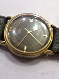 Orologio Seiko 8222-6030. Colore cassa oro, 32mm, quadrante bronzo cromato con indici oro e 12 numero romano datario scatto rapido ore 3, lunghezza compreso cassa 23cm spessore 11mm peso 29g, cinturino originale in vera pelle testa di moro usato ma in buono stato. Vetro con qualche graffio come visibile in foto. Batteria appena sostituita, movimento revisionato segna il tempo regolarmente.