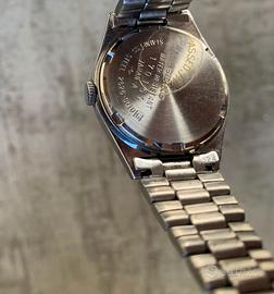 Vendo orologio da donna marca Seiko con movimento a quarzo, con doppio datario, quadrante decorato da due cerchi concentrici, bracciale regolabile in acciaio. Resistente all’acqua, l’orologio è nuovo, cartellinato, perfettamente funzionante e con l’adesivo di protezione della cassa ancora in posizione. Dimensione della cassa: diametro 2,3 centimetri.