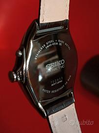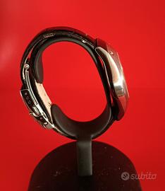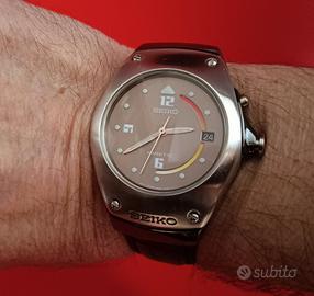 Porto alla vostra attenzione, questo innovativo Orologio dell'azienda di orologeria Seiko, azienda che a rivoluzionato il mondo degli orologi. L'orologio che vi presento e il Seiko Kinetic Arctura 5M42 immesso sul mercato intorno agli anni 85/90, un mix perfetto di tecnologia innovativa,e design senza tempo. Questo eccezionale orologio,e racchiuso in una sorprendente cassa in acciaio inox e ceramica,la quale si presenta in ottime condizioni, la sua misura e di 40/41 mm, corona compresa, mentre senza misurare la corona, misura 38/39 mm, la sua corona e l'originale, così come il suo vetro in cristallo antiriflesso, che garantisce resistenza ai graffi, e un'eccellente trasparenza, molto particolare e il suo quadrante, il quale presenta un Layout pulito e ordinato,con indicatori chiari,a ore tre vi è il datario,il quale funziona correttamente,la data può essere inserita anche manualmente tramite la corona, monta un cinturino in pelle di colore nero da 18mm,con doppia chiusura, infine monta un fondello nero lucido in acciaio inox,nel quale vi sono riportati il marchio e i numeri di referenza dell'orologio, la chiusura avviene tramite le viti,chiudo parlandovi del suo innovativo movimento che rende innovativo l'orologio,il quale non monta né un movimento automatico, né un movimento a batteria, ma funziona con il movimento del polso rimanendo in funzione per giorni anche se non viene indossato, sul quadrante vi e l'indicatore della riserva di carica rimanente, indicatore che entra in funzione tramite il tasto posto sopra la corona di carica, premendo questo tasto potrete verificare la carica residua. Visto che non si possono pubblicare più di sei foto, all'acquirente invierò anche due foto con l'è istruzioni affinché non abbiate difficoltà per l'uso. L'orologio viene proposto completo della scatola Seiko, garantisco sia il corretto funzionamento dell'orologio,sia l'è sue condizioni generali.La vendita e tra privati, la stessa si avvale della formula del visto e piaciuto.