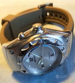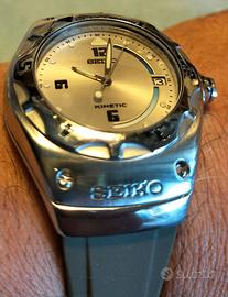 Seiko Kinetic Arctura 5m42-0E60 vintage raro, w.r. 20 bar, vintage anni 90.Guardate bene la foto del fondello , è un modello raro. Bracciale seiko in gomma siliconica nuovo , il suo bracciale originale è stato sostituito . Revisionato luglio 2025 con sostituzione accumulatore condensatore e guarnizione e poi mai utilizzato. Dimensioni diametro 38 mm escluso corona, cinturino in gomma nuovo. Condizioni usato in ottimo stato così come da foto. preferibile ritiro a mano provincia di Caserta , spedisco anche
