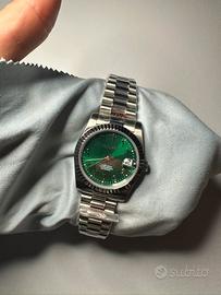 Quadrante verde effetto sunburst con indici applicati in stile arabo e datario con lente a ore 3.