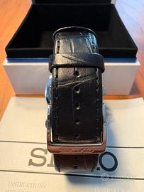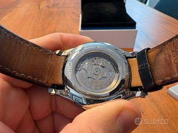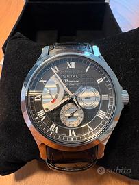 Orologio seiko premier, movimento automatico 6R20, fondello a vista, water resistant 10 bar, misura cassa 42 mm, quadrante nero, cinturino in pelle nera pressoché perfetto, orologio usato ma in condizioni perfette. Full set, completo di scatola, contro scatola e libretto datato e timbrato dalla gioielleria dove e’ stato acquistato.