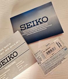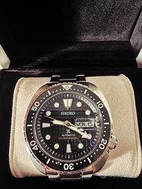 Seiko Prospex "King Turtle", specificamente il modello SRPE03K1. Si tratta di un orologio subacqueo professionale che reinterpreta il design classico "Turtle" di Seiko con materiali e finiture migliorati. Caratteristiche principali: Movimento: Calibro automatico 4R36 con circa 41 ore di riserva di carica e funzione giorno/data. Design del quadrante: Presenta un distintivo motivo a scacchi o "waffle" nero e una lente d'ingrandimento (ciclope) sul datario. Materiali: Cassa e bracciale in acciaio inossidabile, con una lunetta girevole unidirezionale in ceramica e vetro zaffiro antigraffio. Resistenza: Impermeabile fino a 200 metri (Diver's 200m), adatto per immersioni subacquee professionali. Dimensioni: La cassa ha un diametro di 45 mm e uno spessore di circa 13,2 mm.
