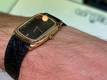 Orologio Seiko in oro 18 kt. - 750, cassa in oro, quadrante nero con indici e lancette color oro, cinturino in pelle nero, movimento quartz.