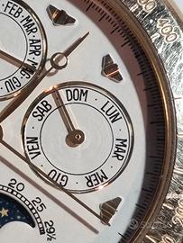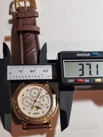 Orologio con fase lunare al quarzo. L'orologio presenta 4 complicazioni principali, oltre alle lancette standard di ore, minuti e secondi. Il sotto-quadrante superiore mostra i mesi dell'anno in italiano e a ore 6 la finestra delle 24 ore, indicando le ore del giorno exsella notte. Il sotto-quadrante a destra indica i giorni della settimana in italiano. Il sotto-quadrante a sinistra indica la data del mese 5(numeri da 1 a 31). Fase Lunare: Posizionata a ore 6, mostra il ciclo lunare. Scala Tachimetrica sull'anello esterno (lunetta fissa) è contrassegnato con numeri che partono da BASE 1000 e continuano con 60, 70, 80... ecc. Cassa: in metallo color oro. Quadrante di colore bianco/avorio, con indici e numeri in un elegante stile classico. Cinturino in pelle marrone con finitura puntinata. No scatola.