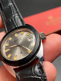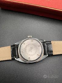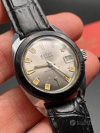 Orologio Skin DiverAstor anni 70, completo delka sua scatola originale. Perfettamente funzionante, in ottime condizioni. Movimento meccanico a carica manuale. Dial argento con indici a tacche in rilievo con inserti luminescenti. Sfere argentate con inserti luminescenti. Piccoli secondi ad ore sei. Datario ad ore tre. Misura cassa escluso corona 31 x 40 mm. Fondello a vite in acciaio inossidabile. Cinturino in pelle nero.