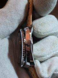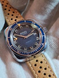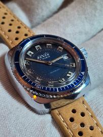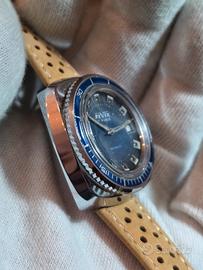 Orologio skin diver vintage Revix meccanico a carica manuale di grandi dimensioni. Cassa in condizioni davvero ottime e ghiera blu stupenda. Quadrante molto bello. Ben funzionante in ogni sua parte. Cinturino racing in pelle nuovo.