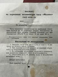 Questo è un orologio da tasca Molina (o Molniya) con 18 rubini. Tipo: Orologio da tasca meccanico. Provenienza: Fabbricato in URSS ("MADE IN USSR"). Caratteristiche: Quadrante bianco con numeri arabi e un contatore dei secondi a ore 6. Movimento: Probabilmente utilizza un movimento di tipo calibro 3602, comune per questi modelli.