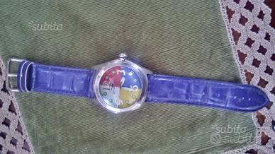 Orologio con cassa in acciaio massiccio come anche il vetro movimento al quarzo cinturino in pelle blu in sintonia con il coloratissimo quadrante mai indossato praticamente NUOVO ideale per un regalo simpatico divertente e vivace