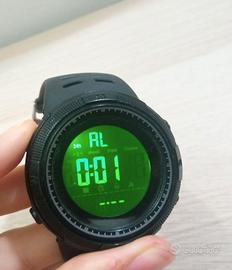 Orologio marca SKMEI modello 1251BK in ottime condizioni, mai utilizzato. Tra le funzionalità: data automatica, calendario perpetuo, sveglia, cronografo, resistente all'acqua (fino a 50 m di profondità senza premere tasti), calendario completo, display a LED, resistente agli urti, retroilluminato (premendo un tastino per qualche secondo lo schermo si illuminerà di verde mostrando chiaramente le informazioni).