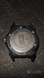 Orologio Sector vintage cronografo da uomo, modello EXP 101 con sub-quadranti, quadrante nero e lunetta beige/nera. Funzionante (senza cinturino e batteria, da sostituire), incluso 2 perni nuovi per bracciale. Dettagli principali: - Cassa robusta in acciaio/resina nera, diametro ca. 42 mm, vetro con graffi leggeri visibili. - Retro "Sector EXP Stainless Steel Water Resistant Design Reg.", water resistant 10 ATM. - Crono con 3 sub-quadranti, design anni '90 sportivo. - Perni nuovi silver inclusi per montaggio facile. Condizioni e stile: Funziona bene, segni uso sul vetro/cassa, ideale per custom o riparazione. Stile racing cool.