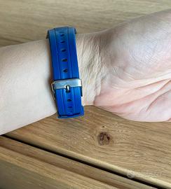 Cassa e cinturino: la cassa è in plastica/gomma di colore grigio e blu. Il cinturino, visibile nel resto dell'immagine, è probabilmente in gomma (PVC), anch'esso colorato in grigio e blu, resistente e flessibile.