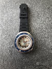 Anni ‘80, compagno inseparabile di tante immersioni ( e si vede…), mai allagato; ai tempi dovetti sostituire le lancette, quindi non sono le originali; anche il cinturino non è l’originale, con uso intensivo alla fine si rompono; tenuto tantissimi anni in un cassetto, l’anno scorso fatto cambiare la batteria e funziona di nuovo; vedo che il giorno del datario non scatta bene.