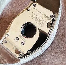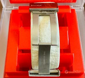 Orologio iconico, con cassa tonda del diametro di 41 millimetri realizzata in acciaio lucido, integrata al cinturino. Il quadrante, ad anello con effetto oleografico luminescente, è digitale con indicazione di ore, minuti e secondi. I pulsanti sono posizionati sul fondello per dare continuità al design. E' animato da un movimento al quarzo. Il cinturino bianco è realizzato in pelle ed è chiuso da una fibbia. Senza confezione originale.