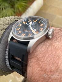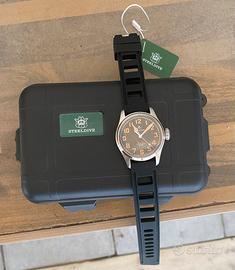Orologio Steelflier Pilot con movimento meca-quartz seiko VH31 (movimento al quarzo che però prevede 4 micromovimenti al secondo in modo da simulare la continuità dei movimenti meccanici rendendolo molto più gradevole alla vista rispetto alla scattosità di un quarzo classico mantenendone al contempo la precisione).