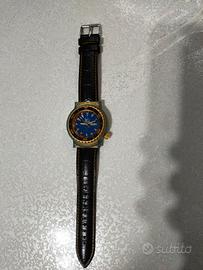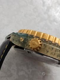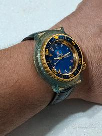 cassa in metallo laminata in oro, quadrante blu oceano a firma di Enzo Maiorca, movimento al quarzo Miyota con tempo, giorno e data, perfettamente funzionante con batteria nuova, fondello e corona con chiusura a vite, WR 150 MT.