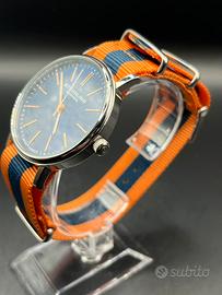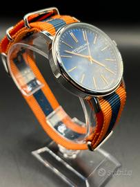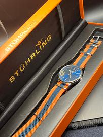 Splendido orologio Stührling Original con quadrante blu effetto soleil e indici sottili dorati. Un segnatempo elegante ma dal tocco sportivo grazie al cinturino NATO a righe arancioni e blu (perfetto per l'estate o per un look casual-chic). • Movimento: Swiss Quartz (precisione svizzera). • Materiale: Acciaio inossidabile (All Stainless Steel). • Vetro: Krysterna Crystal (esclusivo Stührling, molto resistente). • Resistenza all'acqua: 50 metri (5 ATM). • Condizioni: Ottime, completo di scatola originale, panno per la pulizia e documenti di autenticità (come da foto). Ideale per chi cerca un orologio affidabile con un design che non passa inosservato. Tag #stuhrling #orologiouomo #swissquartz #natostrap #orologioblu #menswatch #luxurywatch #stuhrlingoriginal #accessoriuomo #orologiodapolsouo
