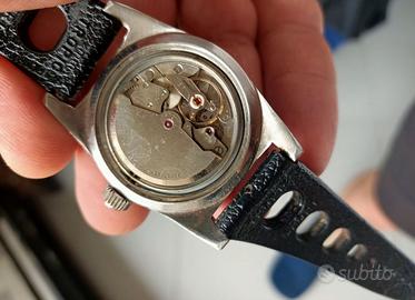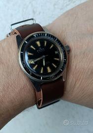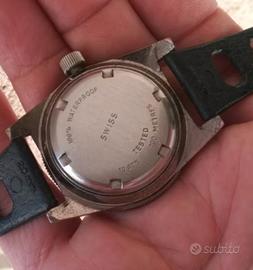Sub Diver Freccione automatico svizzero Hever anni 60 cassa cromata diametro 40 mm. esclusa corona, fondello in acciaio inox, la ghiera esterna, in ottone e bachelite, non ruota. Ottimo e preciso il funzionamento. Splendido quadrante con indici e lancette al trizio invecchiato.