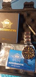Orologio subacqueo automatico Addisdive, come nuovo...vendo perché ho troppi orologi... movimento automatico NH35, 25 rubini, impermeabile 200mt. Corona unidirezionale 120 clic in ceramica, vetro zaffiro bombato trattato antiriflesso. Corona e indici trattati con superluminova.