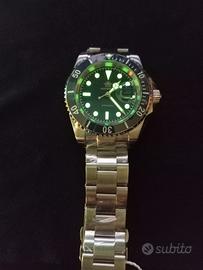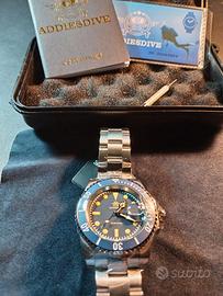Orologio Addiesdive Submariner colore blu piombo, Professional Diving subacqueo 20 bar / 200 metri, vetro zaffiro con lente ciclope per la data, cassa mm.41 fondello e cinturino in acciaio inox L316, coroncina a vite. Lunetta in ceramica verde rotazione unidirezionale a 120 click. Peso gr.163. Movimento al quarzo giapponese Miyota 2115 data automatica, batteria lunga durata (4 anni). Lunetta, scala delle ore e lancette sono super luminosi con luminescenza C3 di tecnologia svizzera. Nuovo e sigillato con plastiche di fabbrica completo di custodia in plastica con rivestimento protettivo antiurto, utensile di regolazione maglie del cinturino, manuale di istruzioni e libretto con numero identificativo. Garanzia di 3 anni direttamente dalla casa produttrice.