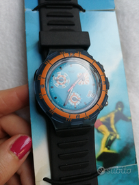 Orologio marca Swatch originale Aquachrono Surf "Ride or Die", serie limitata SBN 400, anno 1997. Resistente in acqua fino a 200 mt. Quadrante azzurro con corona arancione e blu notte, cinturino originale nero di gomma. Quadrante diametro 4,5 cm, cinturino lungo 26 cm e largo 3 cm. Perfetto, come nuovo. Mai usato, indossato solo per le foto qui pubblicate. Completo di cartoncino della confezione originale. Pila da sostituire. Disponibile anche per consegna a mano a Genova e dintorni.