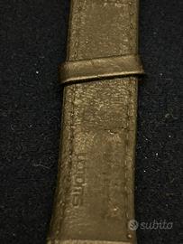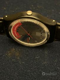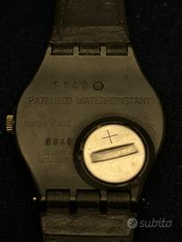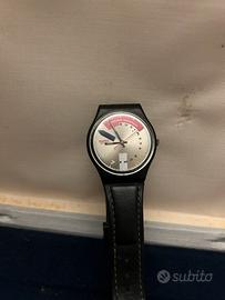 È un orologio da polso dal design essenziale e un po’ rétro della Swatch. La cassa è nera, con linee morbide e leggermente bombate, abbinata a un cinturino in pelle nera. Il quadrante è chiaro, tendente al beige/argento, con un effetto satinato. Non presenta numeri tradizionali: al loro posto ci sono sottili indici lungo il bordo e la scritta “BUSINESS” disposta in verticale sul lato destro. In alto, una fascia semicircolare rossa riporta la dicitura “AROUND MIDNIGHT”, creando un contrasto deciso e grafico. Le lancette sono nere, con quella dei secondi sottile e rossa, che riprende il colore della fascia superiore. Sul lato sinistro del quadrante si vede il logo “Swatch Swiss” in rosso. C’è anche un elemento grafico blu scuro vicino alle ore 9 che rompe la simmetria e aggiunge un tocco artistico. Nel complesso, è un orologio dal carattere creativo e minimalista, con uno stile tipico degli anni ’80-’90, dove design e comunicazione visiva hanno un ruolo centrale.