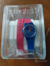 Orologio Swatch con cinturino doppio, colore blu e fucsia, quasi nuovo, con confezione integra, da donna-ragazza. Vendo per inutilizzo.