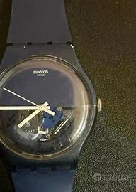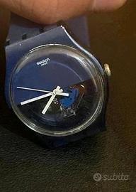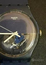 Orologio Swatch di colore blu con meccanica a vista, lancette bianche, perfettamente funzionante in ogni sua parte, venduto con batteria scarica e privo di scatola originale.