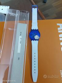 Orologio Swatch Gent Amour Total,GN196. È stato rilasciato come edizione speciale per San Valentino nel 2001. Caratteristiche principali Design: Presenta un cinturino e una cassa in plastica blu con illustrazioni che ricordano un castello o una fortezza, completate da cuori rossi sul quadrante e sul cinturino. Particolarità: Il cinturino è interattivo, con coperture in plastica trasparente rimovibili (visibili nell'immagine) che possono rivelare figure nascoste sottostanti. Confezione: Originariamente venduto in una confezione speciale che includeva una tenda da doccia abbinata a tema. Movimento: Utilizza un movimento al quarzo svizzero ed è resistente all'acqua fino a 3 bar.