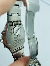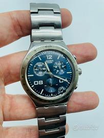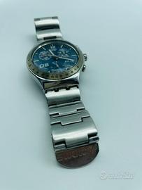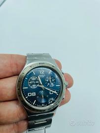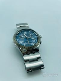 Orologio Swatch Irony Chrono da donna, cassa e bracciale in acciaio, quadrante blu con cronografo a tre contatori, datario a ore 4, lunetta tachimetrica. Modello tipico fine anni ’90/primi 2000. Movimento quarzo, stile sportivo. Venduto senza scatola.