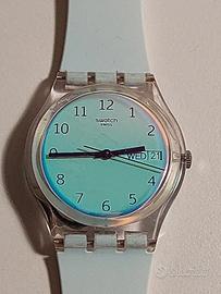 Vendo orologio Swatch modello Ultraciel, modello dal look super pulito e fresco. Cassa trasparente, quadrante azzurro cielo con numeri ben leggibili e cinturino in silicone tono su tono: classico Swatch, leggero e comodissimo al polso. Orologio quarzo svizzero, preciso e affidabile. Usato poco, in buone condizioni generali. Normali segni del tempo, ma nulla che ne comprometta estetica o funzionamento. Vetro e quadrante ok. Perfetto come daily watch, per chi cerca qualcosa di minimale ma con personalità, o come pezzo da collezione Swatch. Batteria nuova e funzionante. Spedizione curata