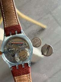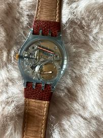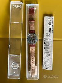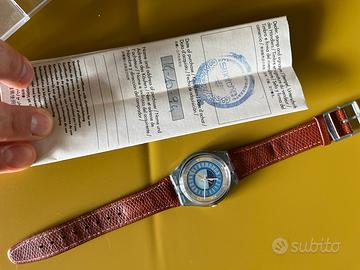 Vendo iconico Swatch Gent H24 GENT TONITE Ref. GN 145 originale del 1994, un pezzo immancabile per ogni collezionista della "Gold Era" Swatch. Questo modello è celebre per il suo splendido quadrante blu notte con grafica a fasi lunari (sole e stelle), racchiuso in una cassa trasparente da 34mm (collezione Gent). Caratteristiche principali: * Condizioni: Ottime condizioni estetiche, perfettamente conservato. * Corredo (Full Set): L’orologio viene venduto completo di scatola originale dell’epoca e certificato di garanziatimbrato e datato 14/10/1994. * Cinturino: Cinturino originale marrone con trama effetto lucertola, ancora flessibile e in ottime condizioni. * Funzionamento: Movimento al quarzo svizzero preciso e affidabile.