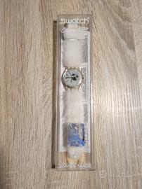 Originalissimo orologio Swatch da collezione,nella sua scatola originale con foglio descrittivo e timbro del negozio. Swatch quartz, Atlanta 1996 creato per i giochi olimpici del Centenario. Quadrante bianco con raffigurante musino di foca e la scritta I ❤️ U. Cassa in acrilico trasparente, lancette argento,cinturino parte superiore in ECO PELLICCIA bianca, parte posteriore in vera pelle. Resistente all'acqua (30m)e antiurto. Movimento a pile. Nuovo, mai usato.