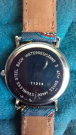 Acciaio inox, quadrante bianco, lancette e numeri neri, cinturino in stoffa fantasia che dona un tono sbarazzino.