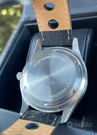 Vendo bellissimo orologio dedicato alla storica Alfa Romeo GT Junior, con quadrante che riproduce fedelmente il tachimetro delle iconiche coupé Alfa Romeo degli anni ’60. L’orologio è nuovo, mai indossato, completo della sua scatola originale. Caratteristiche •Quadrante nero stile tachimetro GT Junior •Scala velocità fino a 220 km/h •Lancetta arancione sportiva •Logo GT 1300 Junior •Indicazione “Riscaldamento” come sugli strumenti originali •Movimento quarzo •Cassa in acciaio inox •Fondello con incisioni tecniche •Cinturino in pelle nera •Diametro circa 40 mm Prodotto dal marchio JANEL, noto per accessori e oggetti ispirati al mondo Alfa Romeo e molto apprezzato tra gli appassionati del marchio. Condizioni •Nuovo •Mai utilizzato •Completo di scatola originale Perfetto per: •collezionisti Alfa Romeo •appassionati di auto d’epoca
