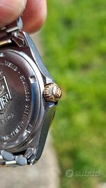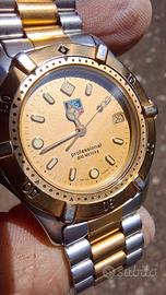 Raro orologio vintage TAG Heuer 2000 Professional Diver 200m Ref. WE1212-R al quarzo, unisex, mid-size 34 mm, anno 1995. Condizioni 100% originale in tutte le sue parti, in eccellenti condizioni vintage, con segni del tempo e dell'usura (vedi fotografie), e perfettamente funzionante. Marca – TAG Heuer. Modello – Serie 2000 Professional Diver. Referenza – WE1212-R. Quadrante – Quadrante oro opaco, lancette Mercedes e indici applicati. Materiali – Cassa e fondello a vite in acciaio inossidabile, lunetta in alluminio, vetro zaffiro. Corona – Originale a vite logata. Movimento – Movimento al quarzo logatoTAG Heuer basato sul calibro svizzero ETA 955.412, con 7 rubini, perfettamente funzionante. Cinturino – Bracciale originale in acciaio inossidabile bicolore logato (senza maglie aggiuntive) – lunghezza massima: 17,7 cm (con estensione per muta 20 cm). Caratteristiche: datario, lunetta girevole unidirezionale con scatto nitido, impermeabile fino a 200 metri. Senza scatola né documenti. Questo orologio non è stato sottoposto a test di impermeabilità. La cassa misura circa 34 mm di diametro (esclusa la corona), 40 mm da ansa ad ansa, 9 mm di spessore e 18 mm di larghezza alle anse. Questo articolo è stato precedentemente posseduto, quindi tieni presente che potrebbe presentare graffi, macchie, scolorimento, desquamazione e deterioramento dovuti al tempo. Salvo diversa indicazione, l'orologio non è stato revisionato, pertanto La sua manutenzione sarà a carico dell'acquirente. Preferisco la consegna a mano a Roma e provincia. Le immagini fanno parte della descrizione. Vendita con formula visto e piaciuto. Se hai bisogno di ulteriori informazioni o assistenza, non esitare a contattarmi. Apprezzo il tuo interesse e sei il benvenuto anche a dare un'occhiata ai miei altri annunci dove vendo anche Longines, Breitling, Citizen, Seiko, Tudor, Hamilton, Delma, Omega, ecc.