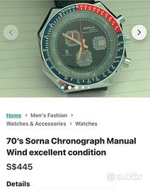 Vendo “(solo x collezionisti, e no a speculatori)” orologio sorna perfetto degli anni 70 carica manuale “praticamente nuovo” un pezzo raro da trovare…no ultimo prezzo.. il mangiare non mi manca😅