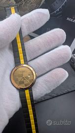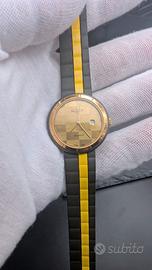 Dotato di datario a ore 3, design pulito e raffinato. Monta un cinturino in gomma bicolore (nero con inserto giallo), che lo rende versatile e comodo anche per l’uso quotidiano.