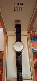 Orologio animato da movimento meccanico a carica manuale a vista sul fondello in vetro minerale. Cassa in acciaio del diametro di 42 mm, corona godronata, anse affusolate. Lancette a foglia per ore e minuti, piccoli secondi al 6. Cinturino in coccodrillo marrone chiuso da fibbia in acciaio