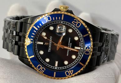 Orologio Tecnotempo - Professional Automatic -Japan Movt - 200M W.R TT.200.PABBG Tecnotempo è un marchio italiano e un marchio registrato. Tecnotempo è il marchio italiano che unisce qualità e design in ogni orologio, per chi apprezza uno stile senza tempo. Ogni modello, realizzato con componenti di alta qualità, rappresenta il perfetto incontro tra tradizione e innovazione, per chi vive il tempo con stile.. Nuovo, con etichetta, confezione e garanzia ufficiale di 2 ann CON DECORRENZA 29 MARZO 2026. L'orologio Tecnotempo è stato realizzato utilizzando componenti di prima scelta: Custodia in acciaio inossidabile completa di trattamento nero PVD Movimento Automatico giapponese Miyota affidabile Meravigliosa quadrante nero Anello girevole unidirezionale blue-gold tone (Importante: si prega di notare che in alcune condizioni di illuminazione il colore dell’anello può apparire viola, ma è blu, molto bello) Vetro zaffiro Data (per evitare possibili danni al meccanismo dell’orologio, non cambiare manualmente la data con la corona se l’orario dell’orologio è tra le 20:00 e le 3:00, questa è una regola valida per tutti gli orologi con data) Bracciale in acciaio Jubille con chiusura a farfalla e trattamento nero PVD Corona a vite Fondo cassa a vite con movimento visibile 200 metri / 20 BAR Resistente all’acqua Diametro cassa: 42mm (esclusa la corona) Spessore cassa: 12,3mm Larghezza cinturino: 20mm La circonferenza dell’orologio è di circa 21cm Peso: circa 160g